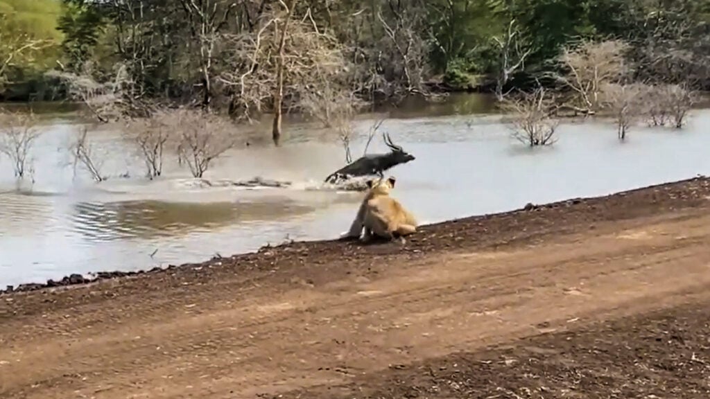 Unsurprisingly, the ram reacts immediately. Dodging the crocodile, it sets off for dry land. There is only one problem. The lioness has been watching, and sensing another opportunity, she rises to intercept the hapless antelope.