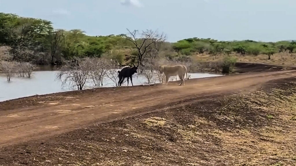 As the video draws to an end, we see an incredible sight. The lioness has given up and saunters down the road. This, to the relief of both the antelope and the stunned onlookers.