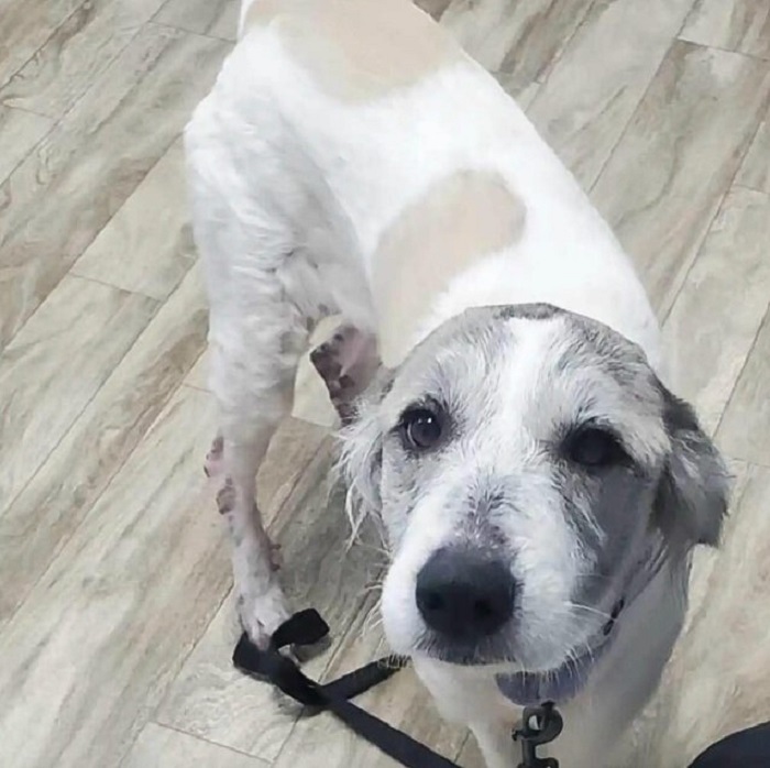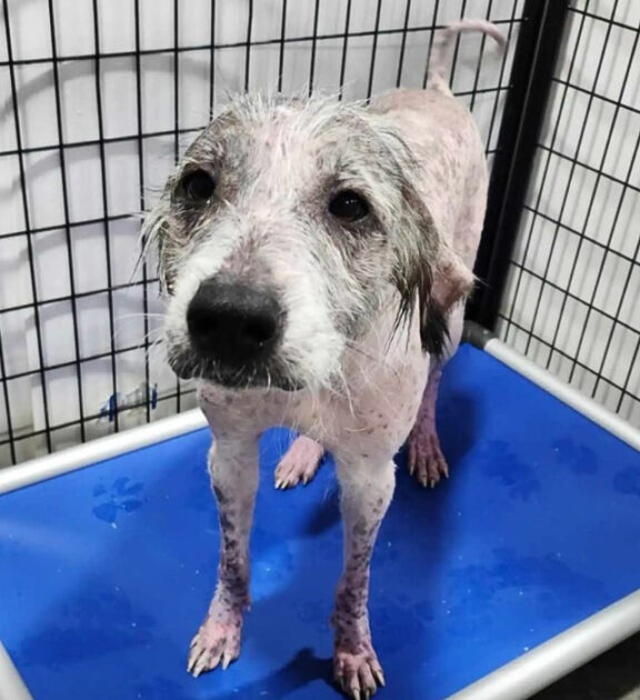 Her body was marked by severe neglect and painful sunburns, her skin raw and exposed, with only a few tufts of fur clinging to her face.