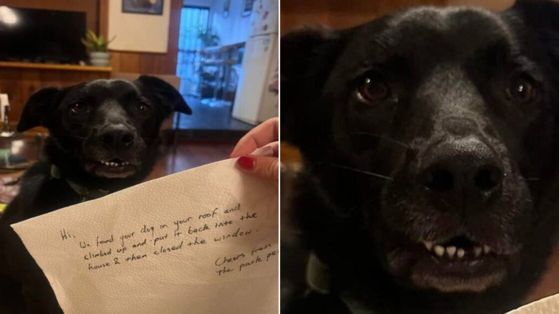 This time, however, Zwar was shocked by what she read on the note. The note said: Hi, we found your dog on your roof and we climbed up and put him back into the house and then closed the window. Cheers from the park people.