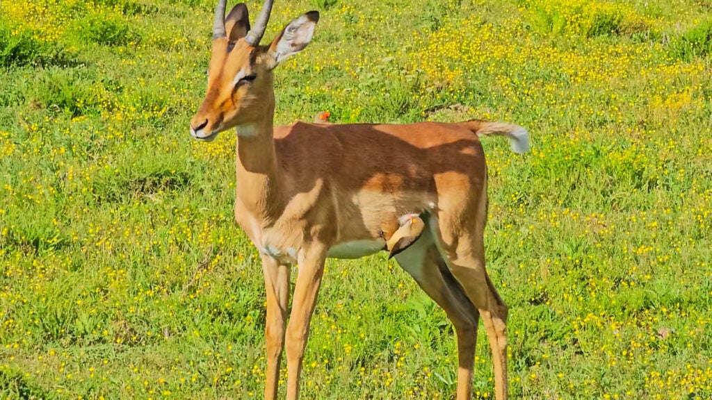 While chatting with guests and keeping one eye on the cat in the distance, Cameron noticed an odd interaction playing out directly in front of them. A red-billed oxpecker was clinging to an impala, with a beak was full of hair.