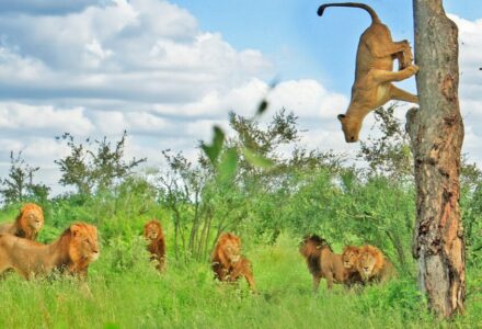 Desperate Lioness Takes to the Trees as Males Close In