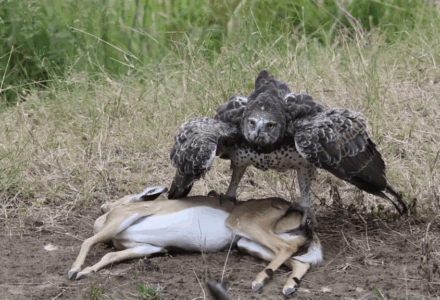 Martial Eagle Fights Vultures For Its Prey