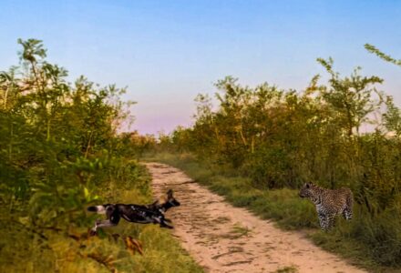 Wild Dogs Chase Leopard During Hunt