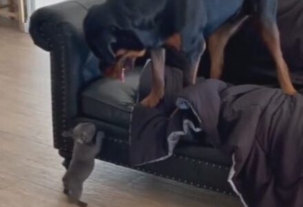 Rottweilers, typically known for their strength and confidence, are often seen as unshakable. But picture this: a large, dominant Rottweiler completely immobilized by a tiny puppy, so…