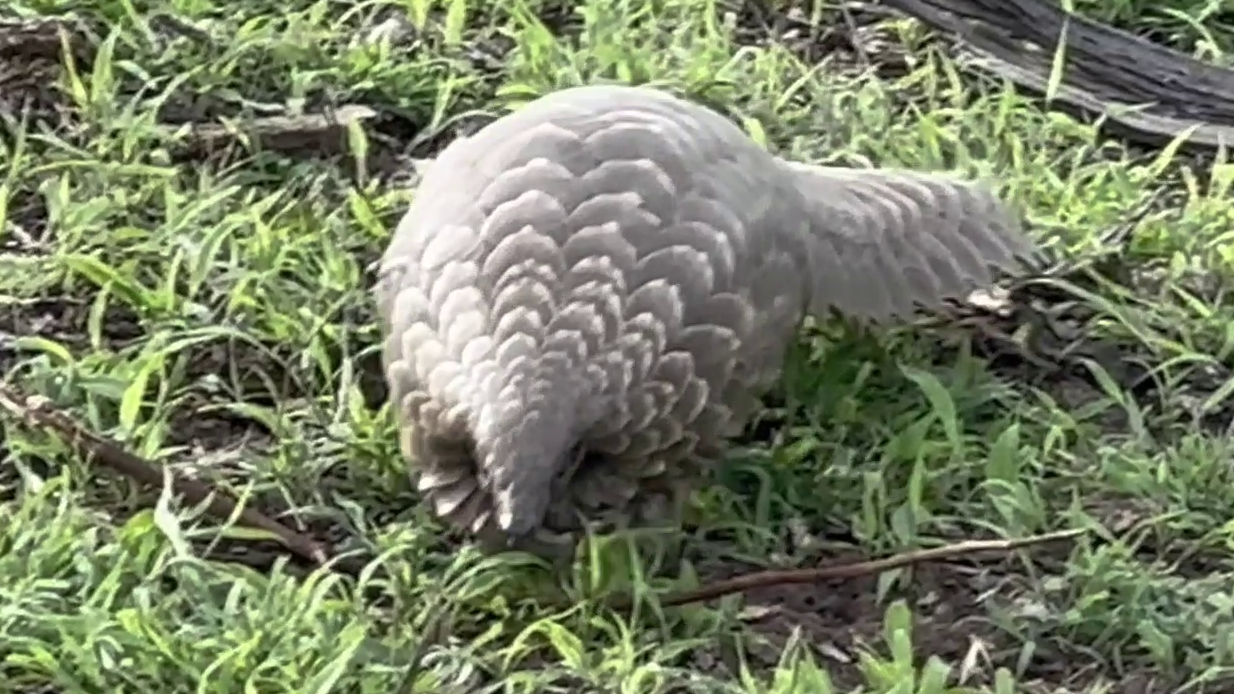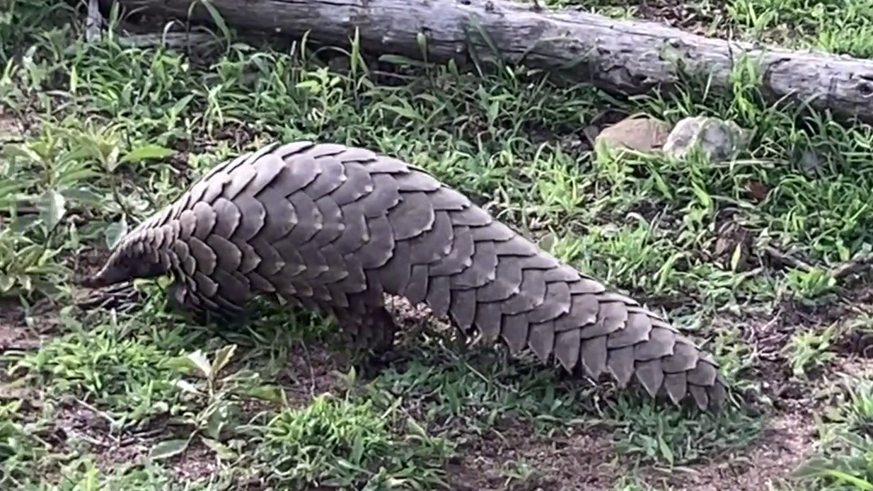 Michael’s video begins with an extraordinarily rare sighting. We see a pangolin, making its way through a field of green grass.