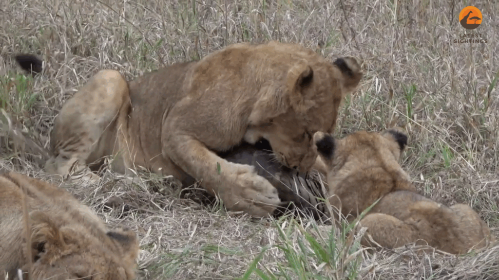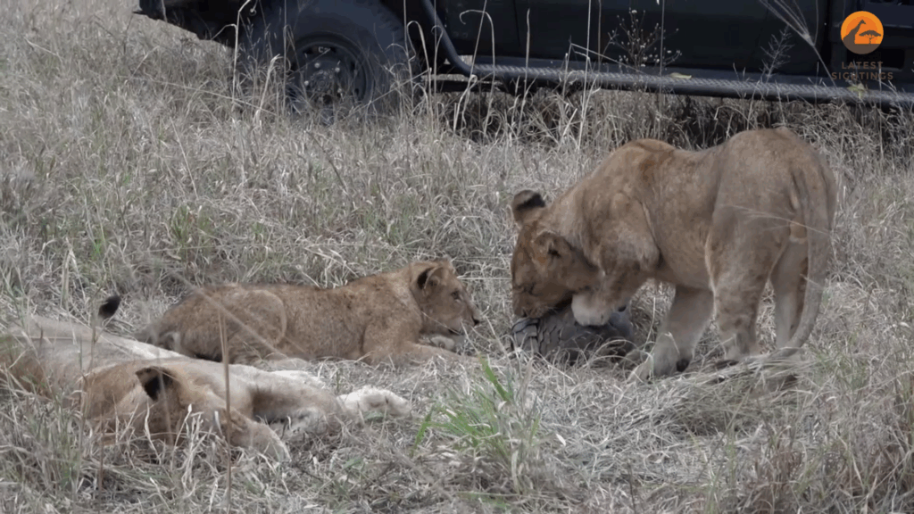 Next, the video cuts to a seemingly unrelated scene showing a pride of lions resting. Unlike sightings of pangolins, this is not at all uncommon.