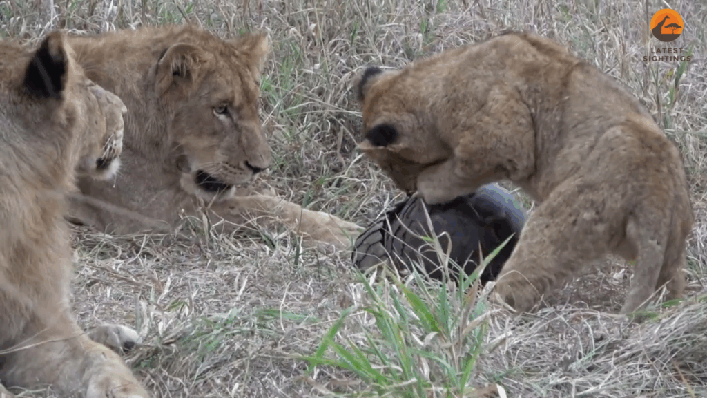 In the next scene, we see that one of the cubs seems to have found a ball to play with. Watched by its younger sibling, it holds the ball steady while trying to bite it.