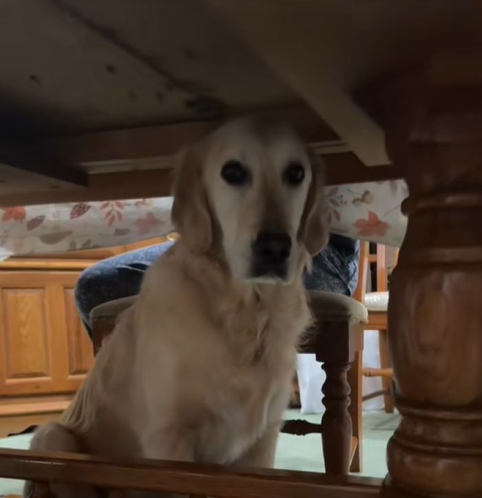 This one time, Gilbridge went to pick her up, and the dog straight up just wouldn’t budge. She hid under the table and just gave his owner a look.