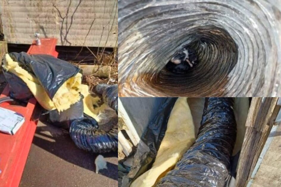 The trailer was in a state of complete disarray, making it difficult to pinpoint the source of the faint cries. Volunteers Angela DiPilla and Sharon Sponheimer carefully combed through the mess until they began hearing soft meows coming from a pile of old insulation tubes.