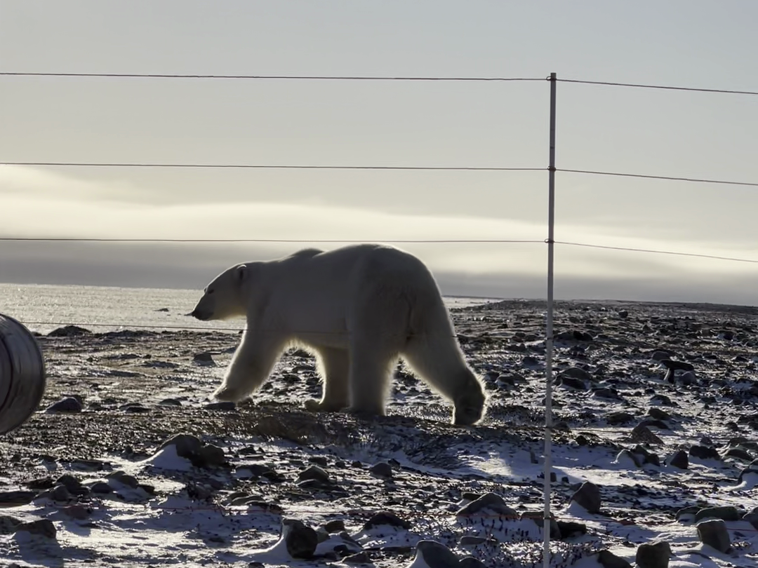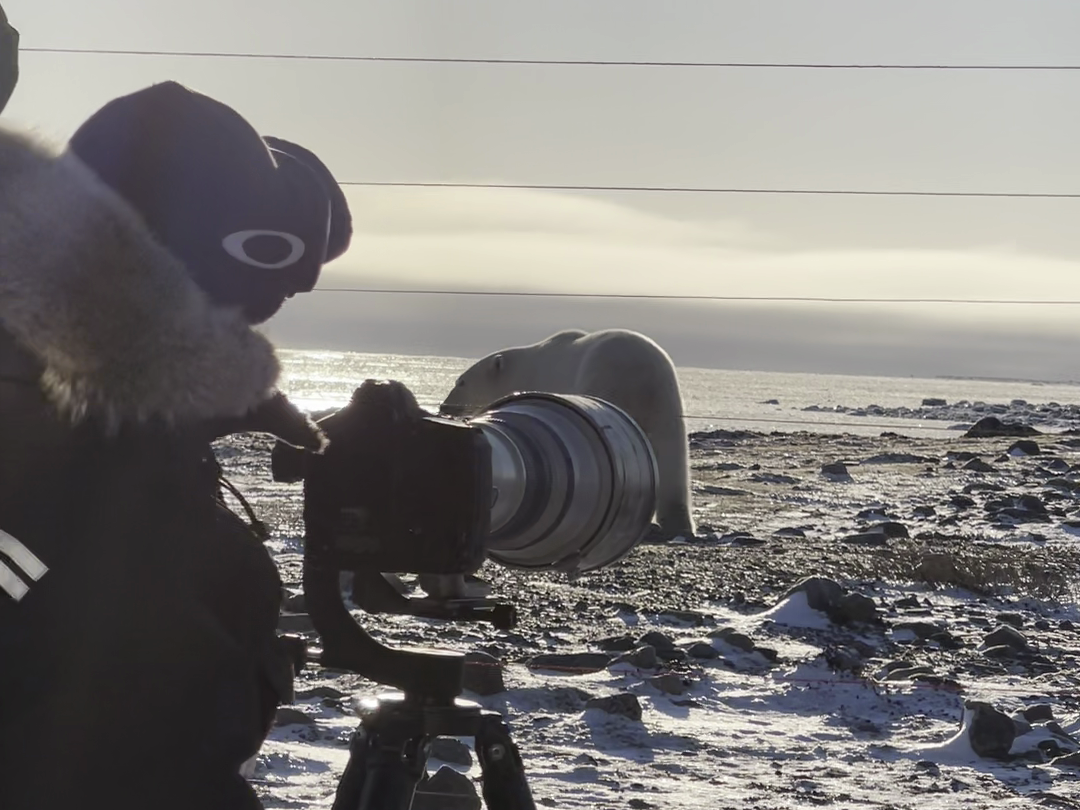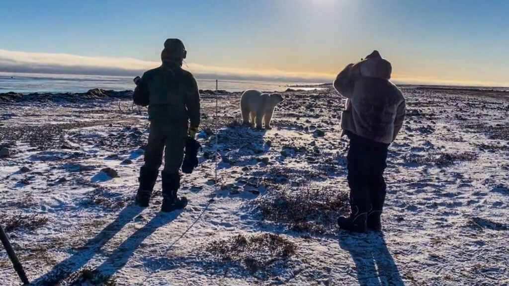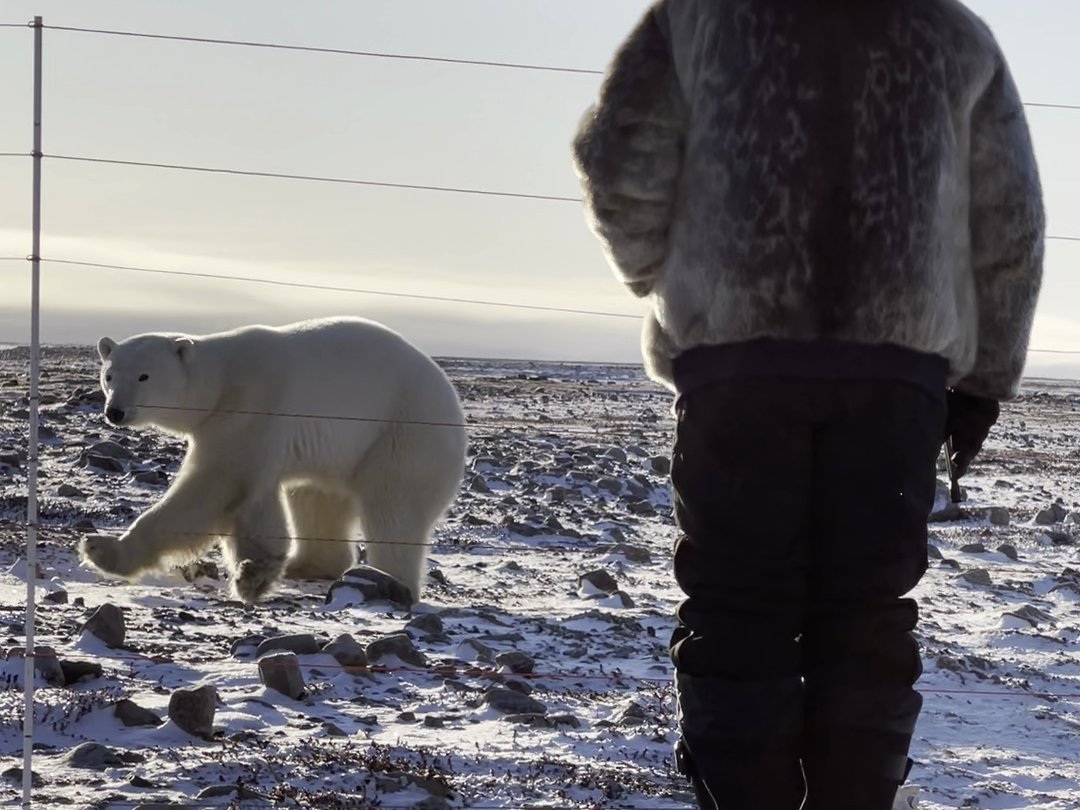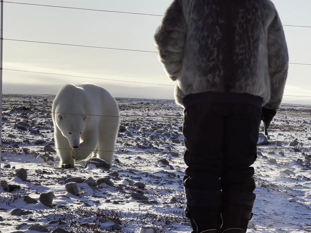 As the video begins, the opening sequence appears to depict men in a perilous situation. Two men and a polar bear engage in a tense standoff.