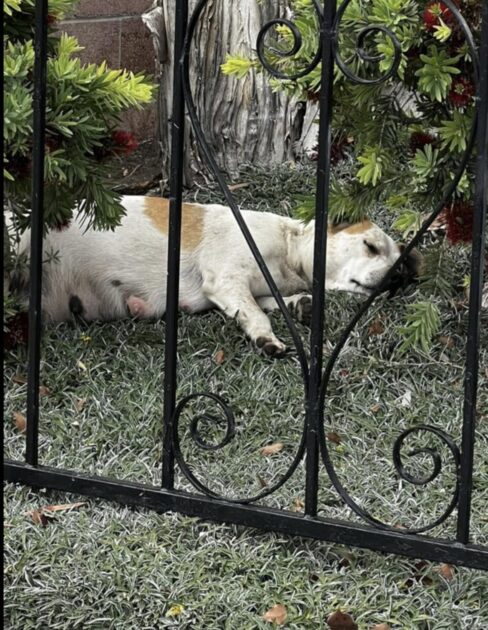 Searching for a place that felt safe, she settled beside a fence in a California yard, hoping it would offer protection when her puppies arrived.