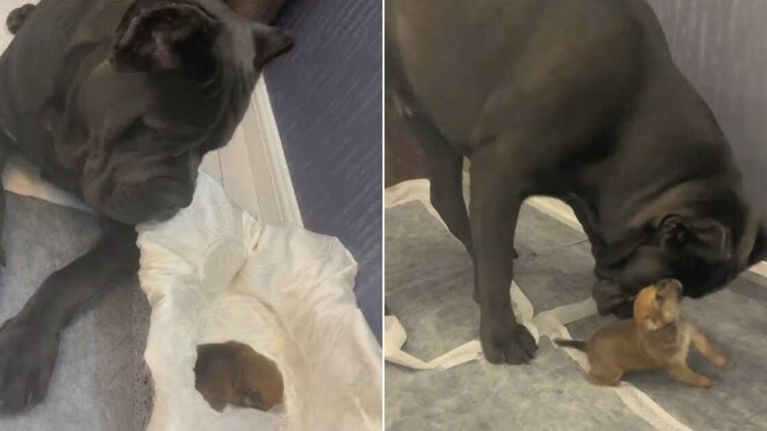 The neighbor’s dog who had given birth recently decided to let this puppy feed, which was amazing news for the rescuers, as it meant that she wouldn’t have to do this by herself all the time.