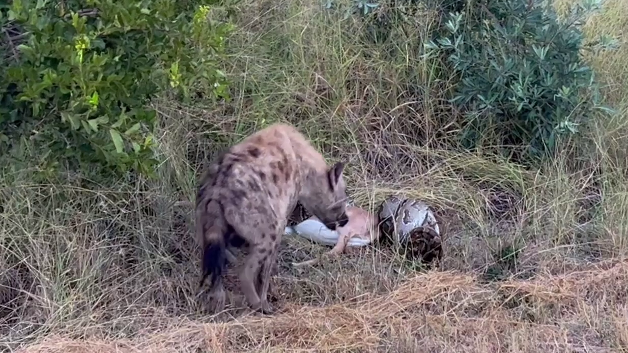 Finally, satisfied that the python was gone and no other opportunistic scavengers were waiting around, the lucky hyena lowered its head to feed.