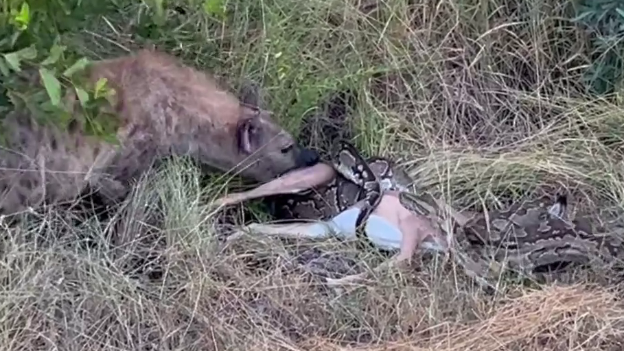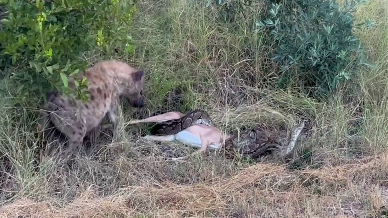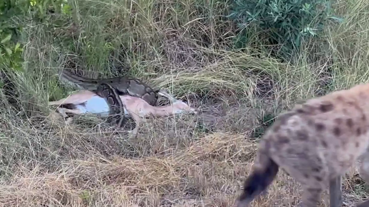 Initially, it is difficult to determine whether we are looking at the head or tail end of the snake. However, as it senses the hyena’s presence, its head pops into view near the impala’s head.