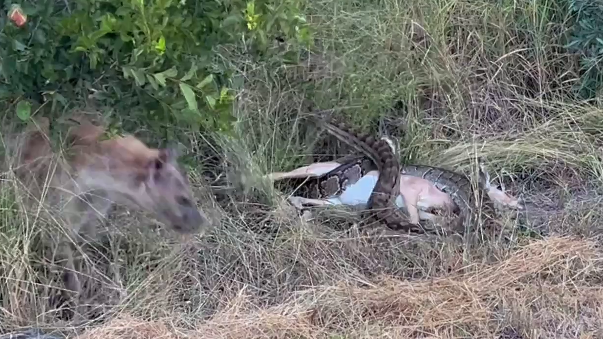 With that avenue blocked by the aggressive python, the hyena looked for a different way to approach the problem. After extricating itself from the bush, it circled the python at a safe distance.