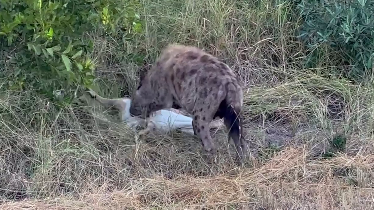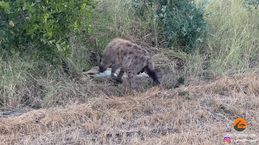 As we join the action in Ryan’s video, we are met with an unusual sight. A spotted hyena is approaching something on the ground, but at first glance, it might not be obvious what it is.