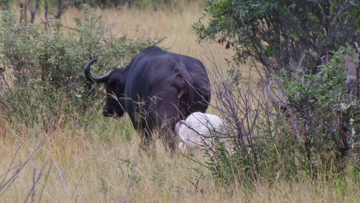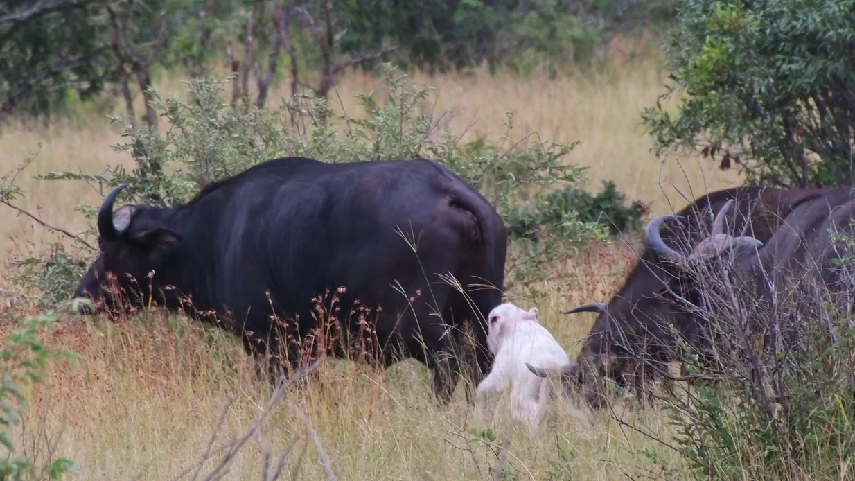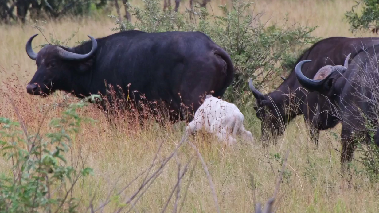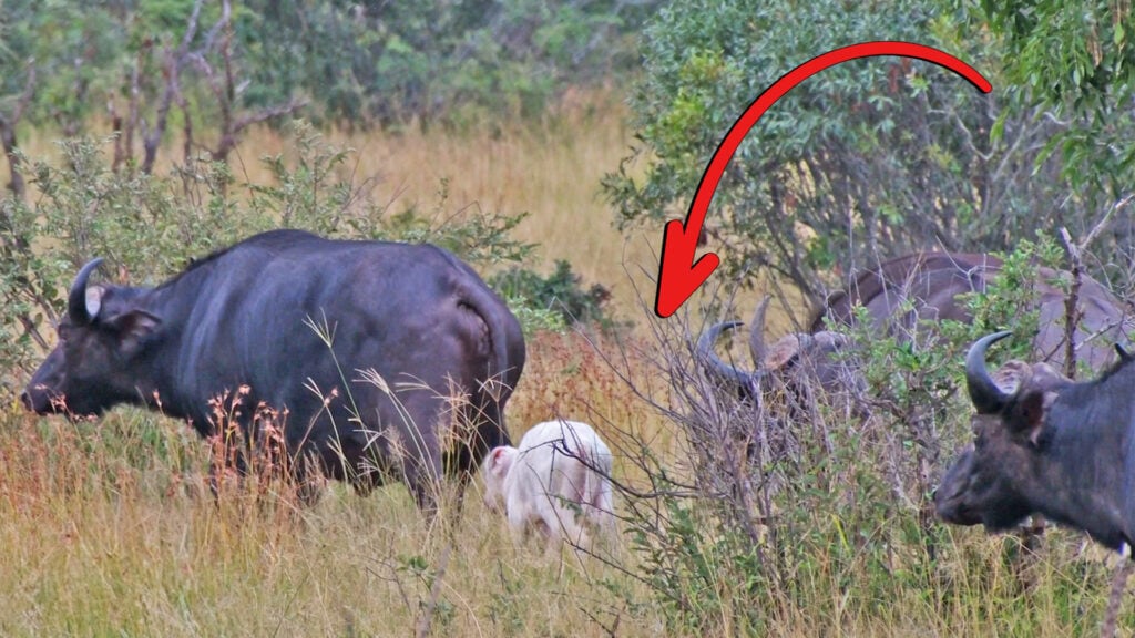 As the calf follows its mother closely, it stands out against the tan background. While buffalo don’t necessarily rely on camouflage to avoid predators, this calf’s colour would undoubtedly make it a prime target, particularly at night.