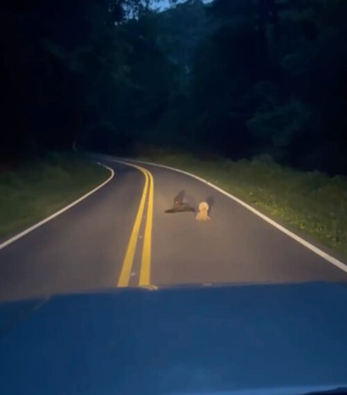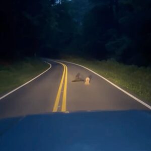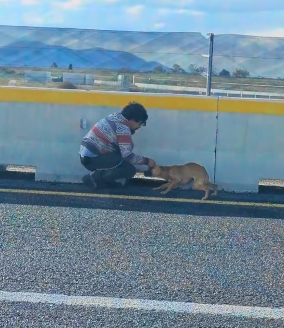 Erick waited for the cars to pass, crossed the road carefully, and gently lifted the trembling dog into his arms before carrying her back to safety.