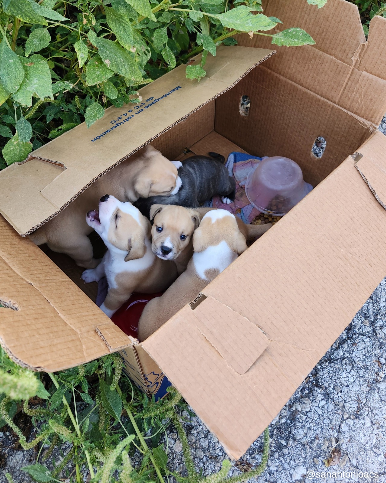 In Texas, a passerby noticed a cardboard box tucked deep inside some overgrown roadside bushes. They had a sinking feeling about what might be inside. When they opened the box, their fears were confirmed: five tiny puppies were huddled together, scared and alone.