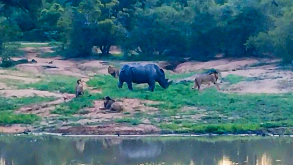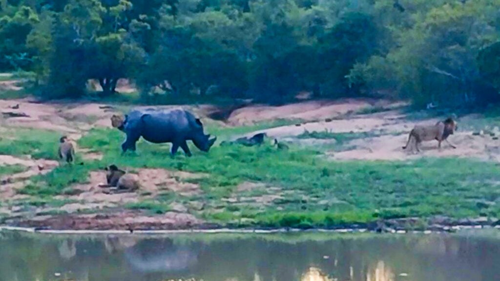 But lions aren’t the only animals that demand respect, and although this huge rhino appeared to be alone, it had size and strength of its own to make sure the lions didn’t test its resolve.