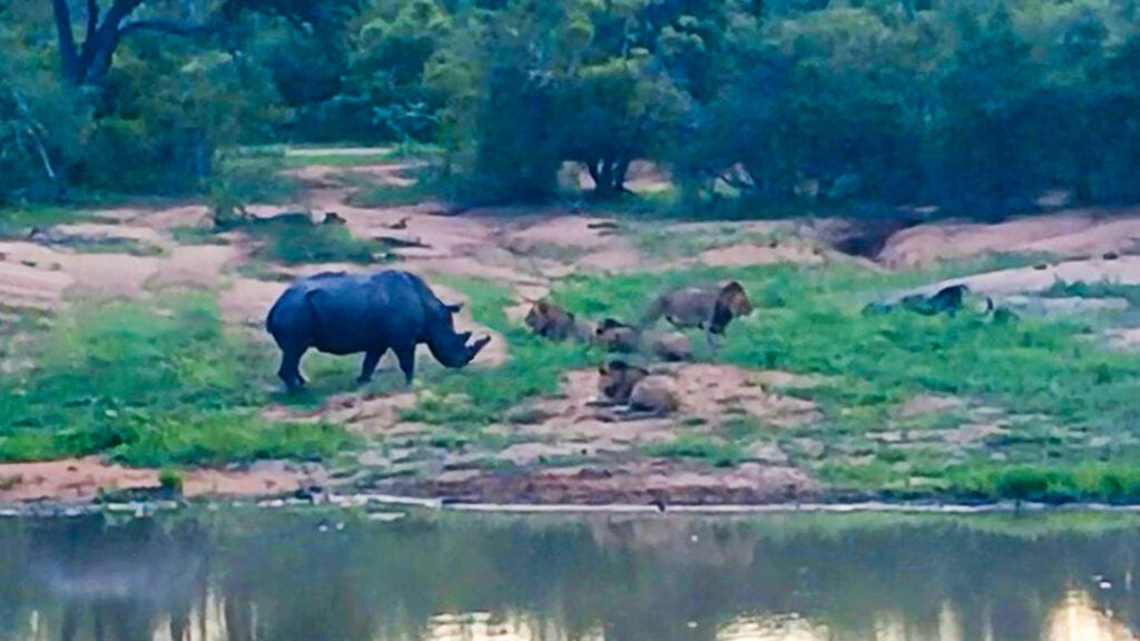 But lions aren’t the only animals that demand respect, and although this huge rhino appeared to be alone, it had size and strength of its own to make sure the lions didn’t test its resolve.