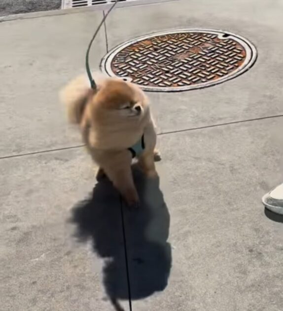 A sudden gust almost lifted the five-pound pup off the pavement, but his mom’s steady grip on the leash kept him safely grounded, averting what could have been a truly alarming moment.