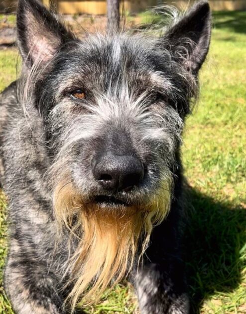 His size, coloring, and whimsical beard often spark curiosity. Even so, he is nothing more than a warm and friendly dog who loves making people happy.