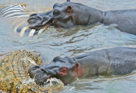 Hippo Feasts On Zebra Carcass In River