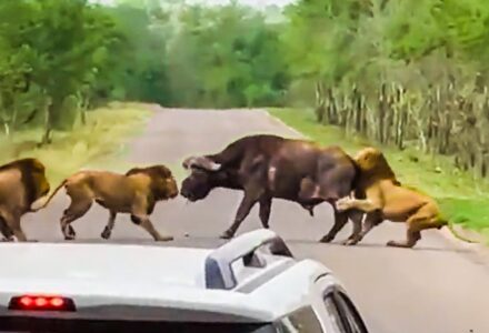 Lions Hunt Buffalo In The Middle Of The Road