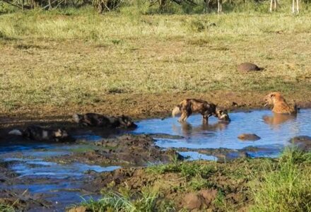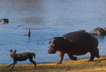 Wild Dogs Get More Than They Bargained for from a Grumpy Hippo