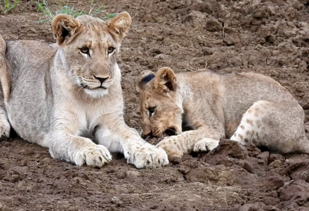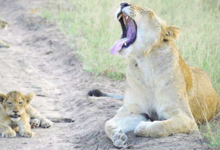 With all of those cubs, one couldn’t blame the lioness for being a tired mother. She reclined with her cubs and did what tired moms often do……