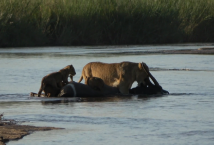 Lion Cubs Use Buck as Raft Pulled By Their Mother