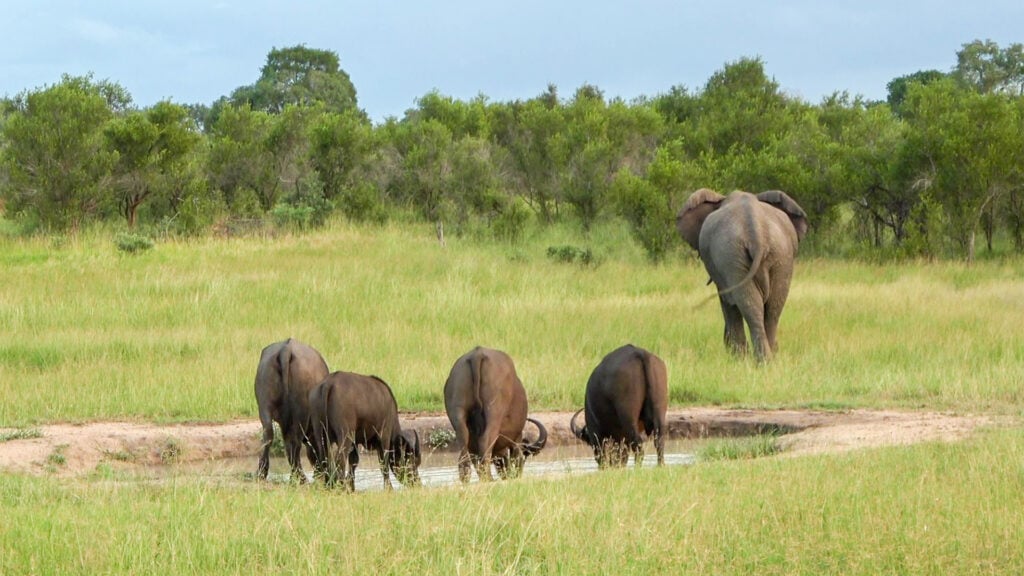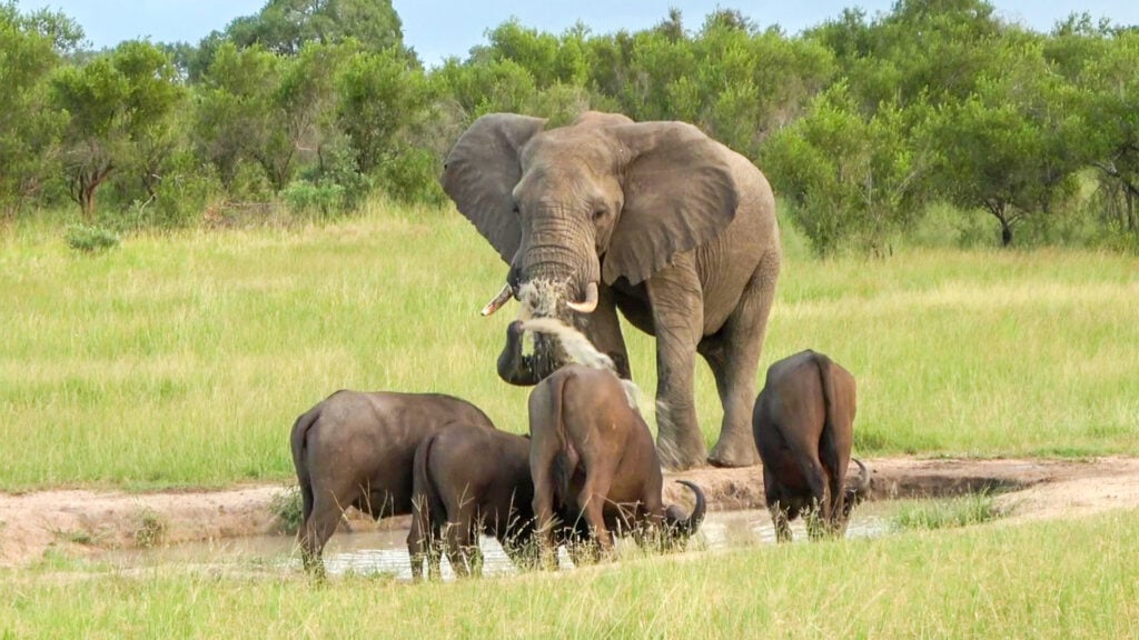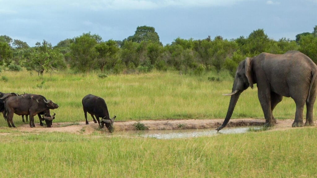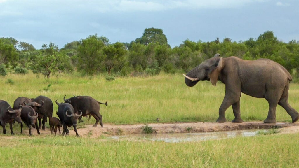 Both elephants and buffalo rely heavily on the same water sources, especially during dry periods, and encounters like this are a test of nerve rather than outright aggression.