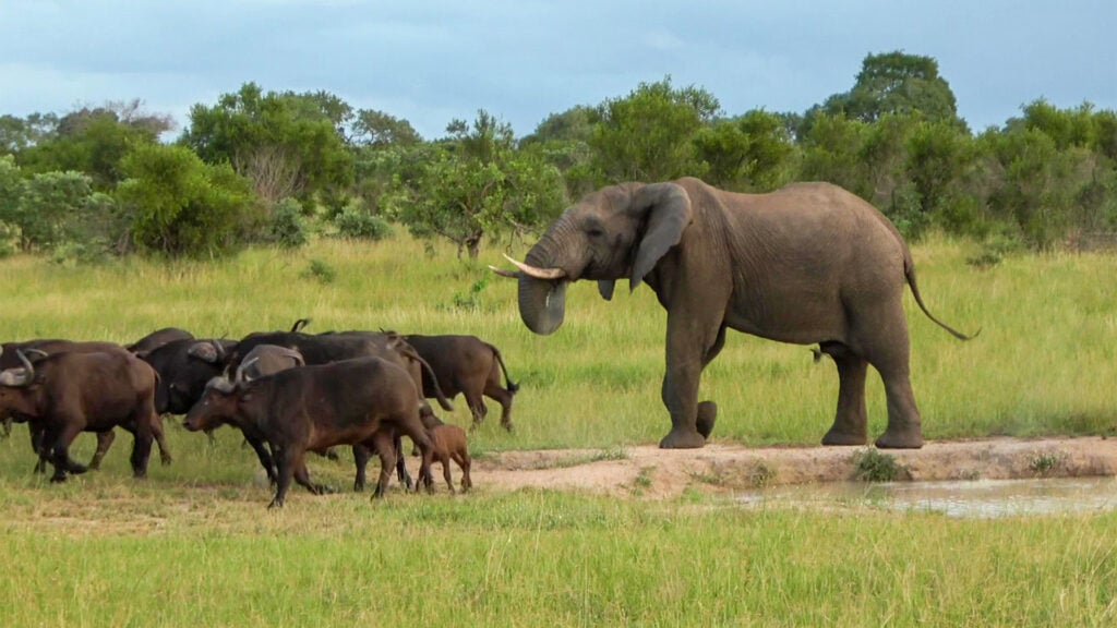 Both elephants and buffalo rely heavily on the same water sources, especially during dry periods, and encounters like this are a test of nerve rather than outright aggression.