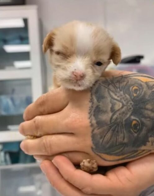 The tiny pup was also severely underweight, making it difficult to determine her exact age. She was estimated to be around two weeks old.