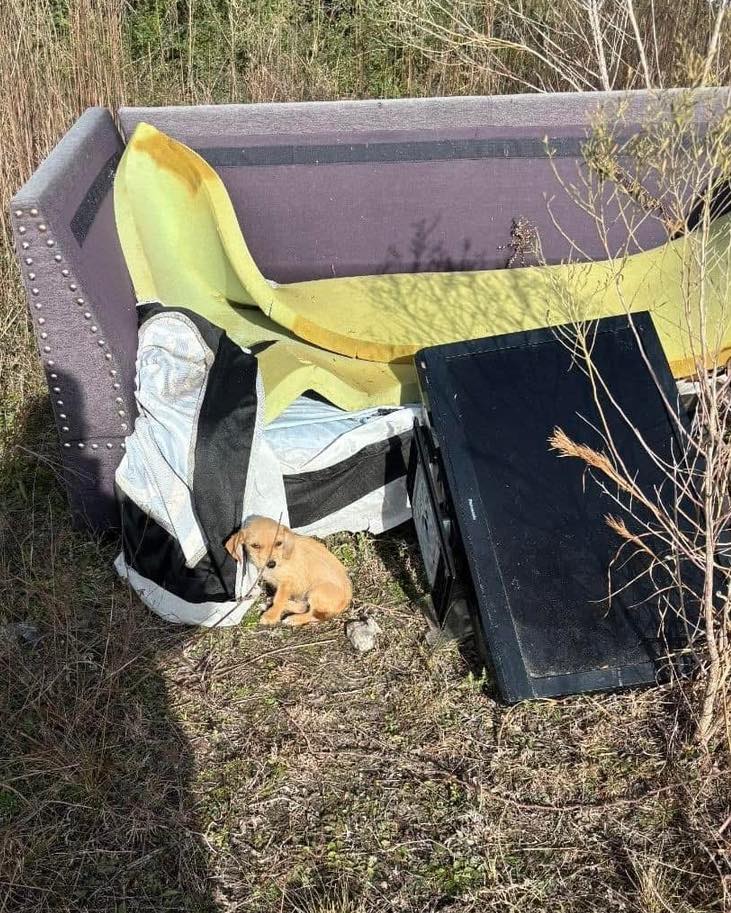 The little dog had taken shelter between a broken TV and an old couch, trying to stay warm. It was as if he had been waiting for someone to finally notice him and offer help.