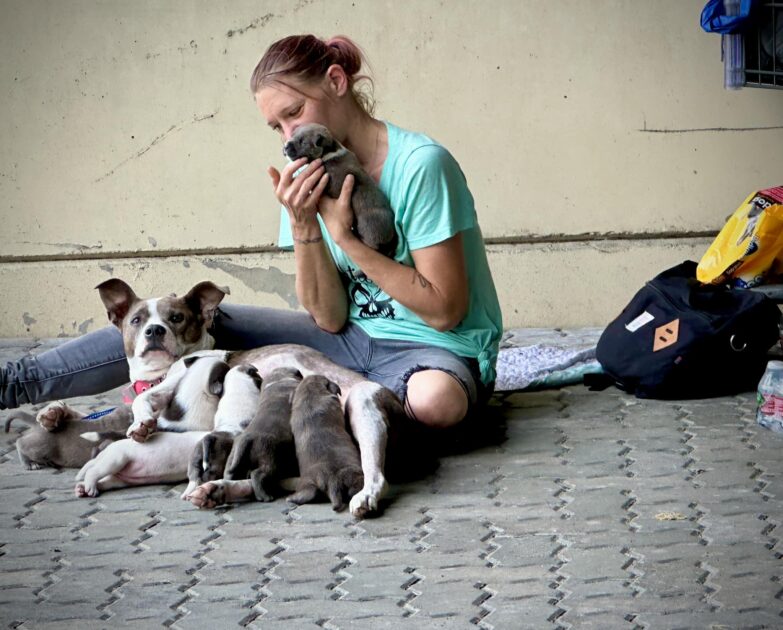 A homeless woman stood nearby, watching over a weary mother dog and eight tiny puppies, all pressed close together under the relentless heat.