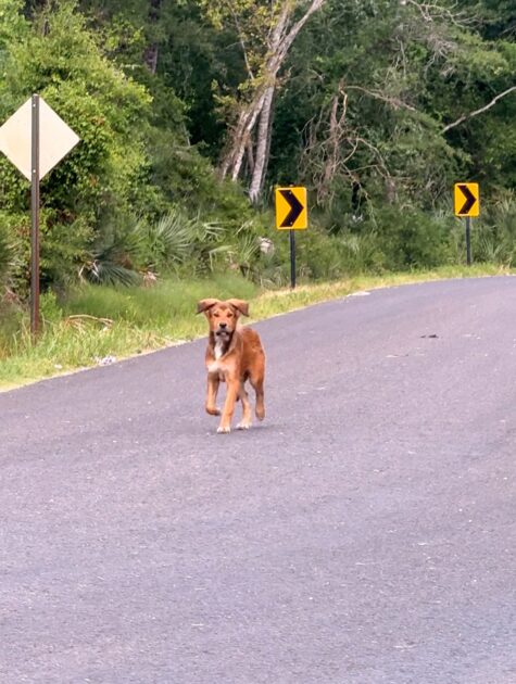 Kristin, who runs Streethearts Project, a rescue organization based in Dayton, Texas, turned down the quiet, rural stretch and began scanning for any signs of life. Then, she saw it: a small puppy frantically running after a car, as if pleading for help.