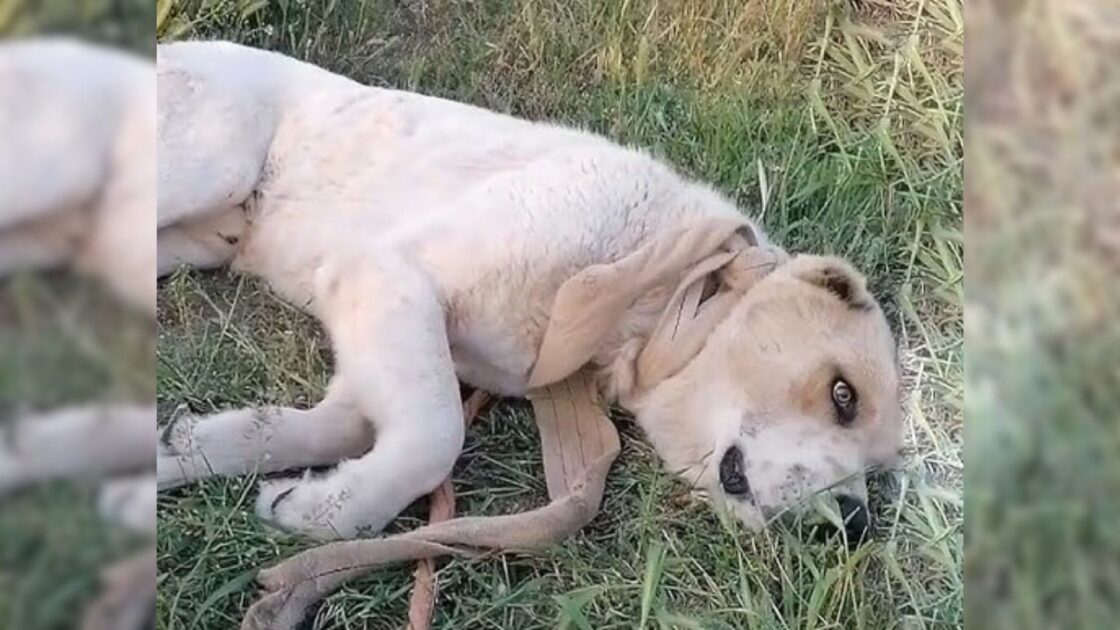 After getting closer, the woman realized she was looking at a very large dog lying in the grass. He had some kind of a rope around his neck.
