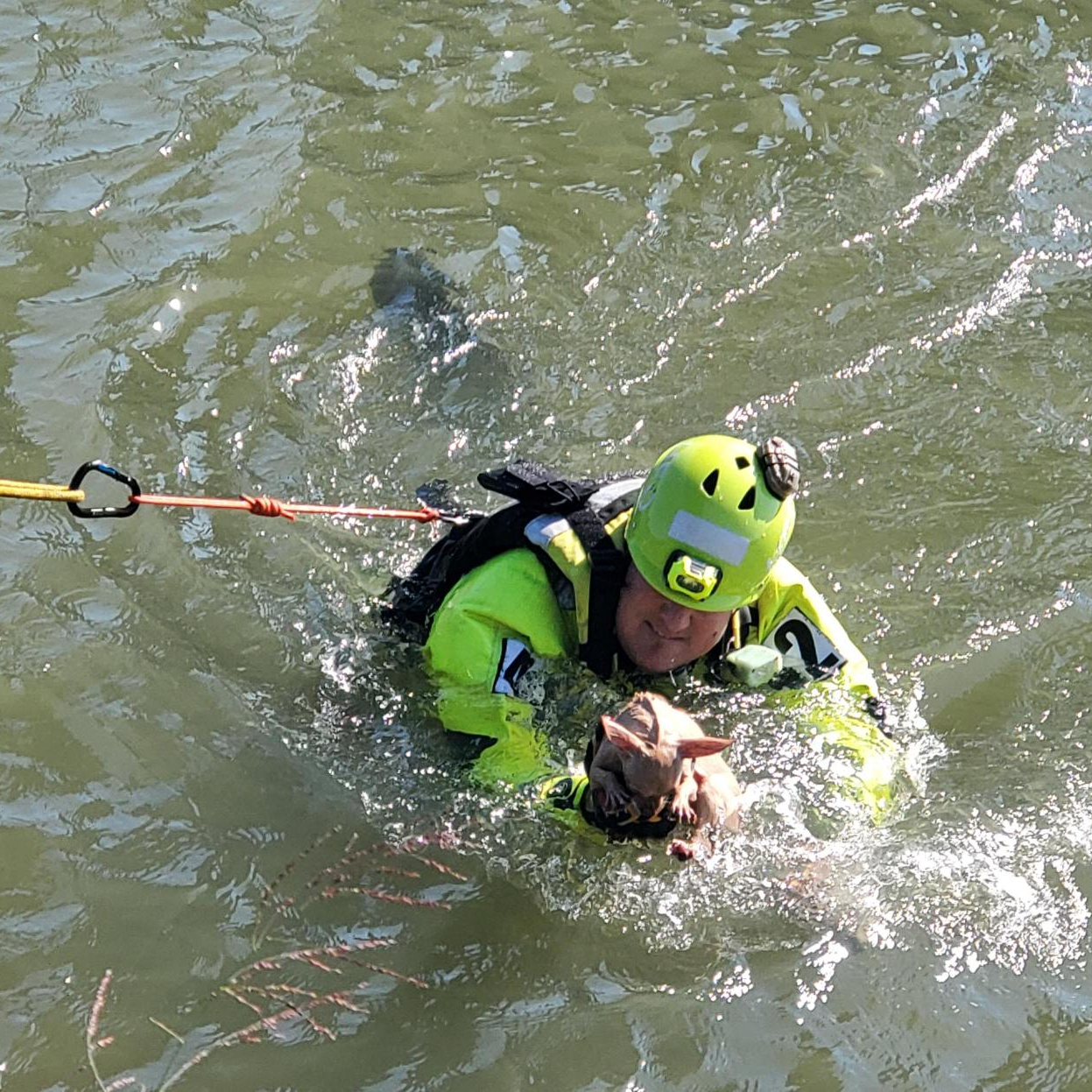 Firefighters arrived and one entered the water without hesitation, swimming toward the anxious pup.