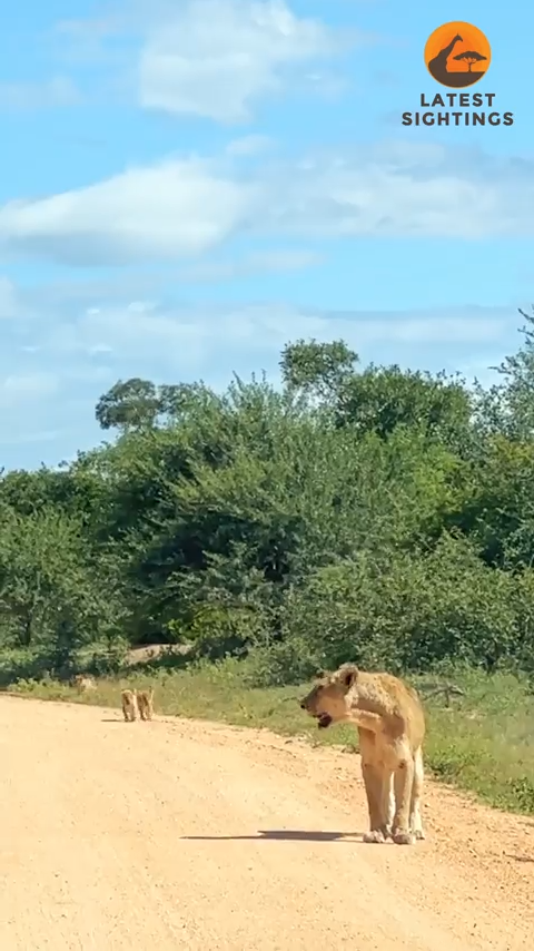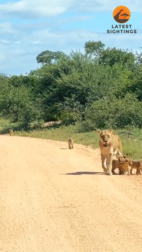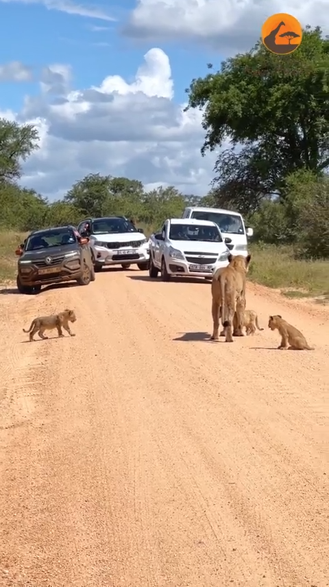 The cubs and the lioness all started walking up and down and zigzagging across the road. “I’m not sure what they were doing, but to us, it almost seemed as if she was showing off her cubs!”
