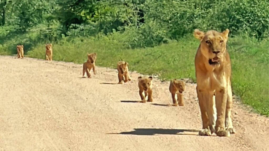 However, soon after getting up, she let out a call and six of the cutest lions cubs emerged. Loyal to mom, they were determined to keep up with her and what followed was some beautiful and memorable viewing.