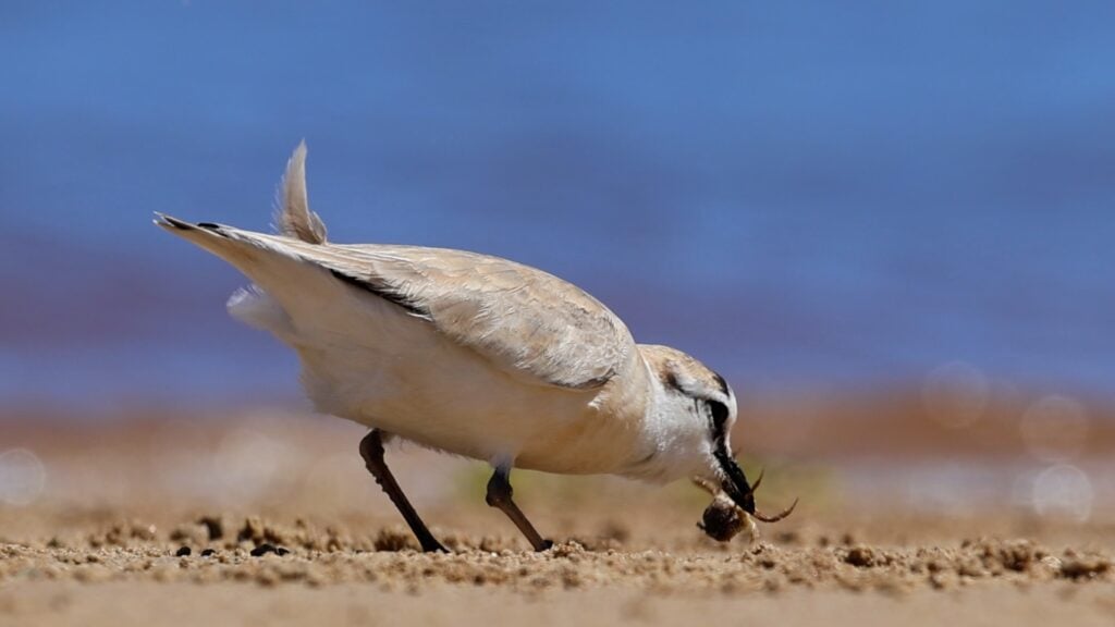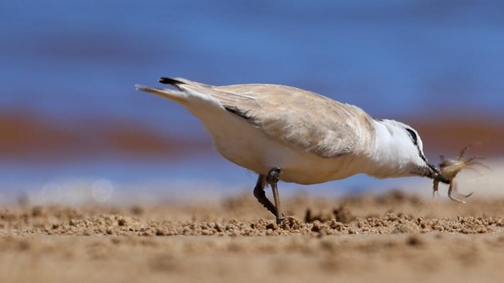 If the crab is small enough, the plover will swallow it whole. However, if it’s too big or has strong pincers, as in the case with this objectionable crab, the bird will use a clever method. It will shake the crab violently or peck at it repeatedly to disable it, often aiming for the legs or pincers to immobilise it before eating.