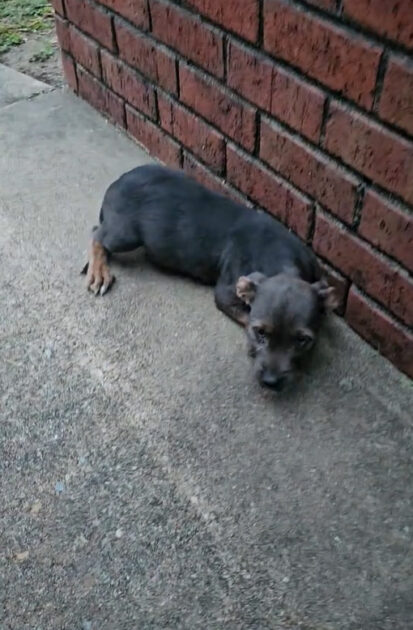 Kelly had just stepped outside her home when she noticed a small puppy pressed tightly against the brick wall near her door.