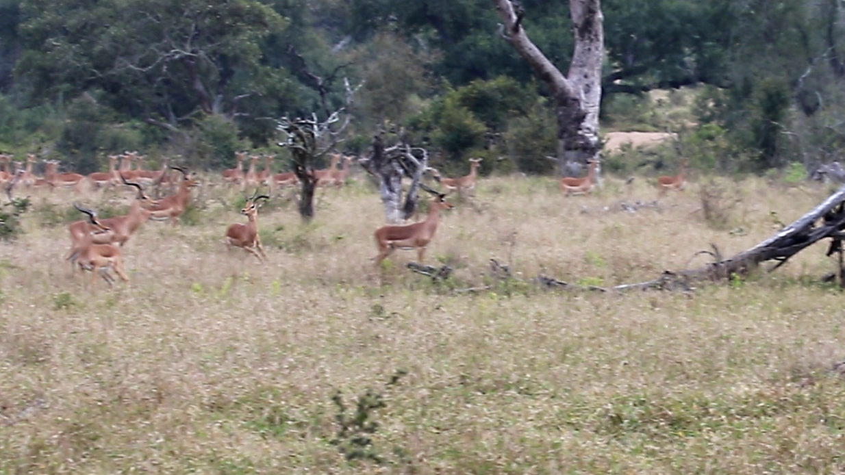 Meanwhile, the camera pans back to the left, revealing a large herd of impalas adjacent to thick riverine bush.