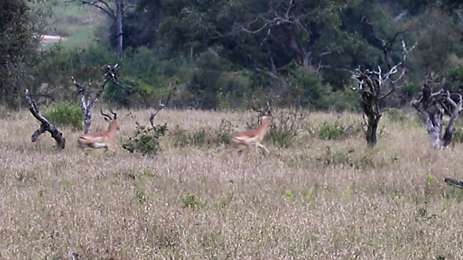 Whatever the case, from what we can see, the cheetah doesn’t get even remotely close to the impala. As for the impala, they scatter in all directions. While some head for the thickets, two of them outflank the predator and run in behind it.