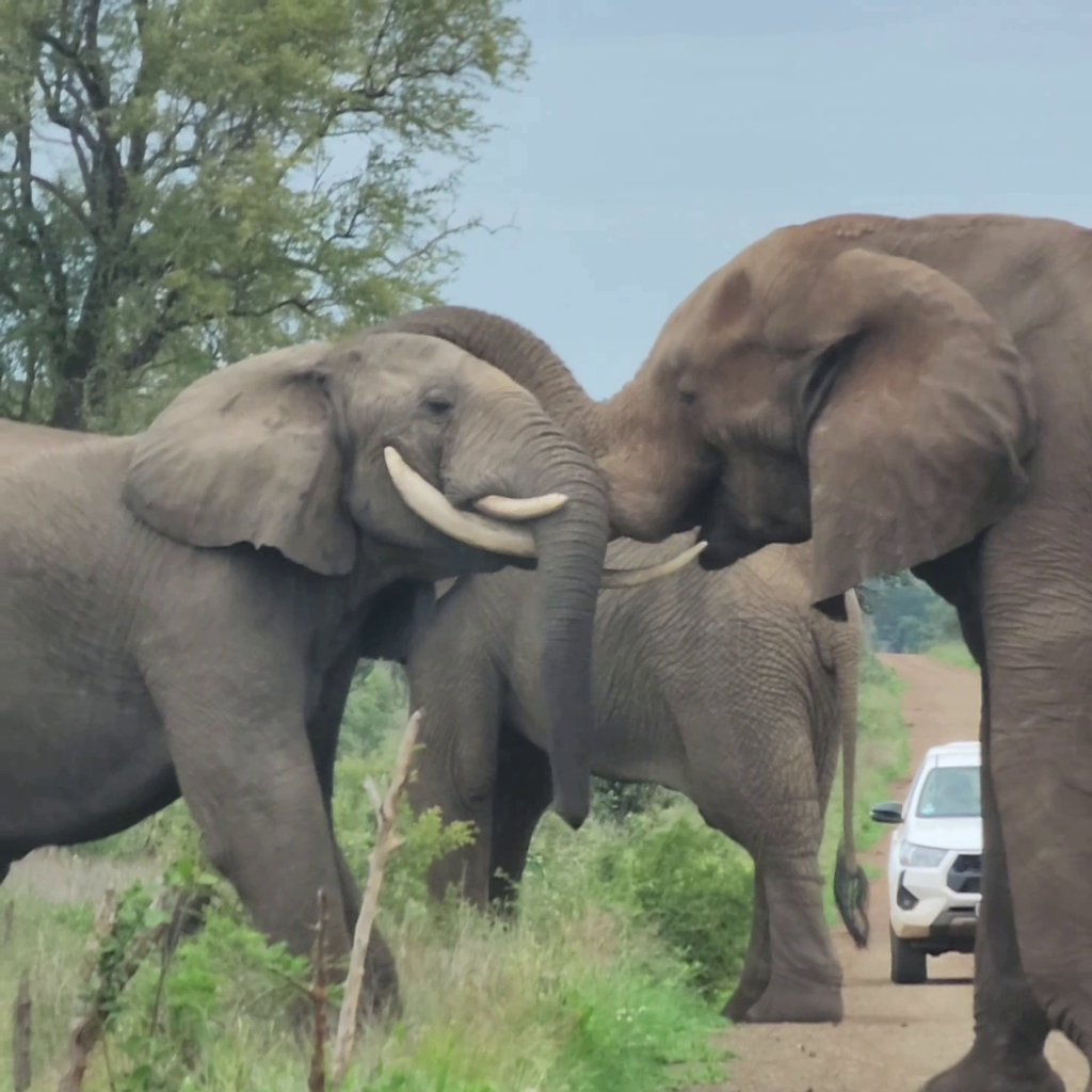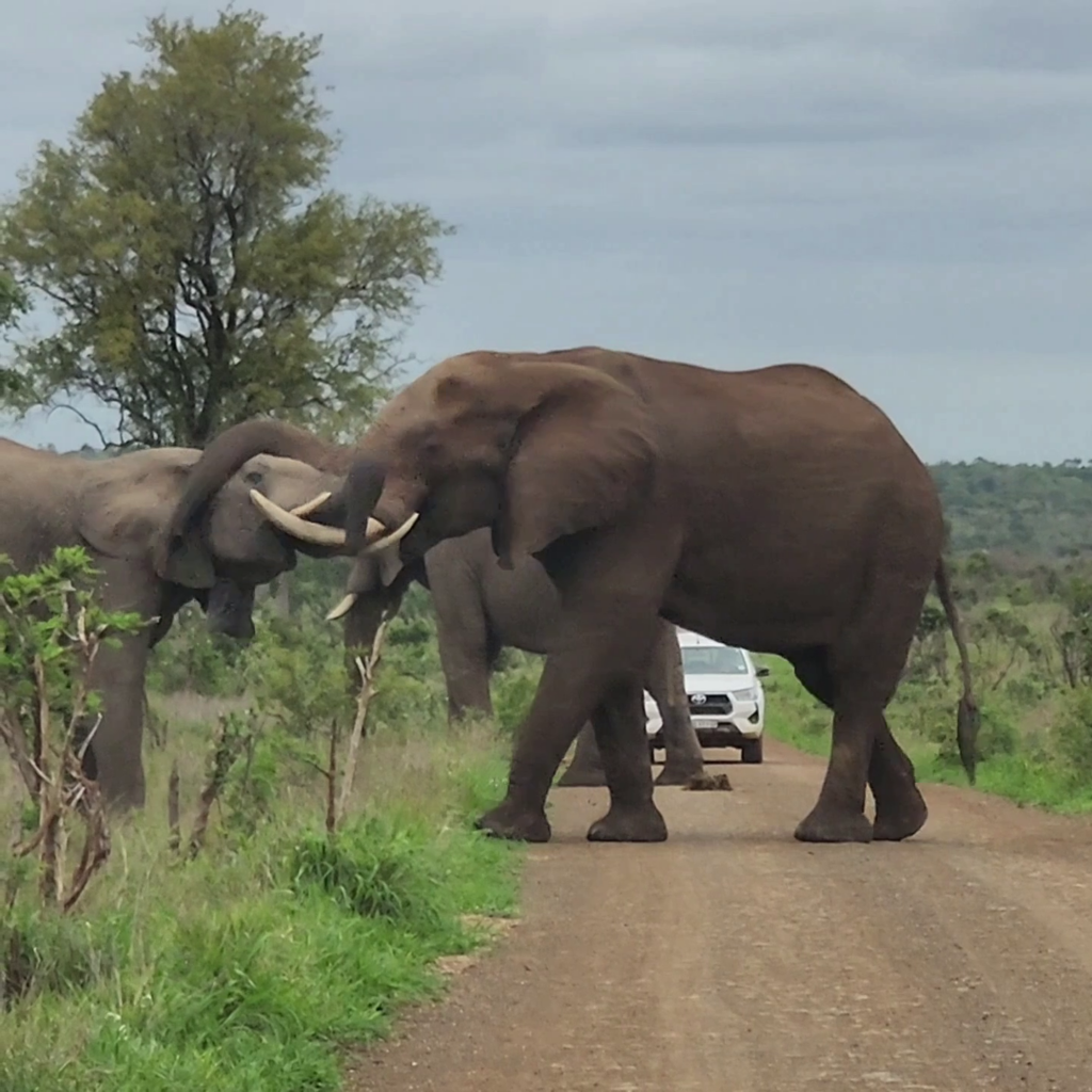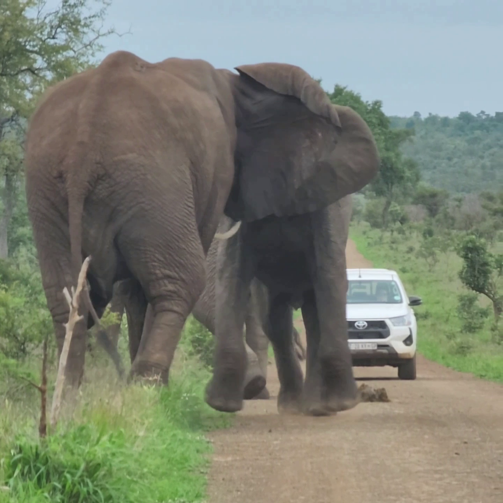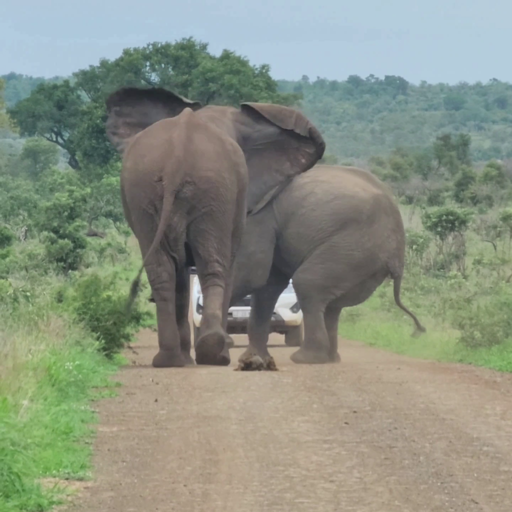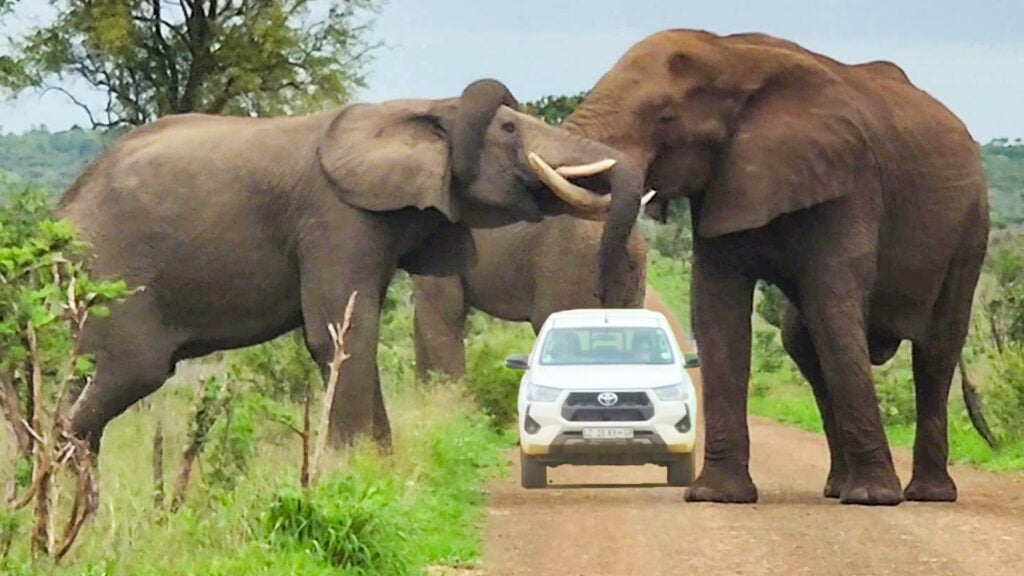 As we join the action in Dirk’s video, we see the road ahead blocked by a massive obstruction. Two elephant bulls are engaged in an apparent disagreement.