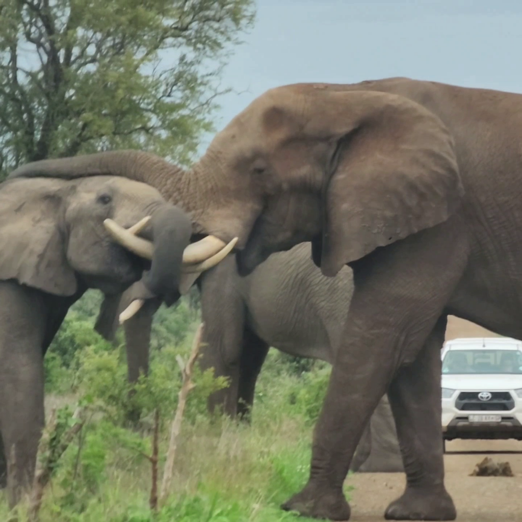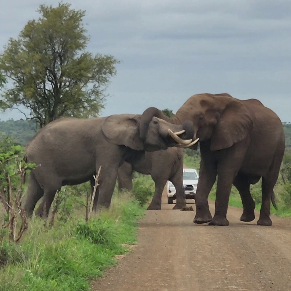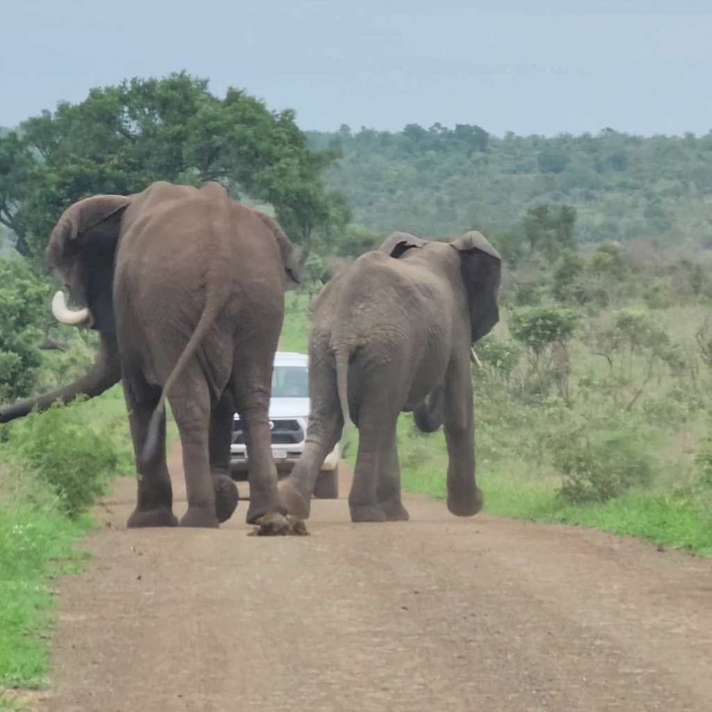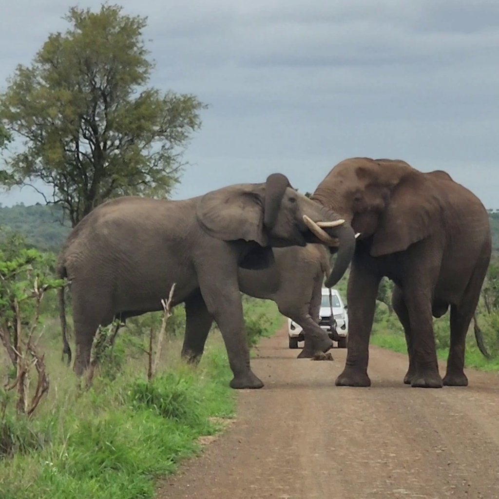 As we join the action in Dirk’s video, we see the road ahead blocked by a massive obstruction. Two elephant bulls are engaged in an apparent disagreement.