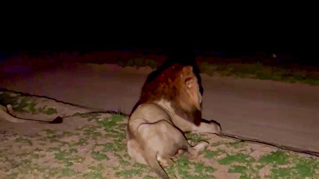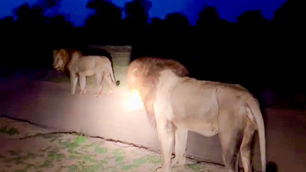 Safari guide Gabriel Harmer was on a night drive in MalaMala Game Reserve when he came across an amusing yet fascinating moment. Gabriel was filming two male lions resting calmly on the side of the road, illuminated by the beam of a flashlight amid the near-total darkness.